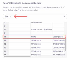 - Si es la primera vez que cargas un archivo de este banco, te aparecerá un tutorial que nos ayudará a la lectura correcta del archivo. En el Paso 1 visualizarás una muestra del archivo, y se te pedirá que selecciones el numero de la fila en la cual están los encabezados o títulos de la tabla de transacciones. Si la tabla no tiene titulos, selecciona»No tiene encabezado»; seguido te pedirá inlcuirla el numero de la fila donde esta la primera fila de la tabla sin encabezado.